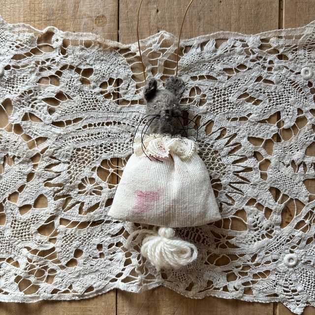 ねずみのオーナメントです クリスマス時期のオーナメントとして お使いいただいたり、普段もキーホルダーや 壁に下げたりして飾っていただけたら 嬉しいです レース、ボディはアンティークを使用しています 体長10cm(頭からしっぽまで) 頭 ビスコース 詰め物 化繊綿