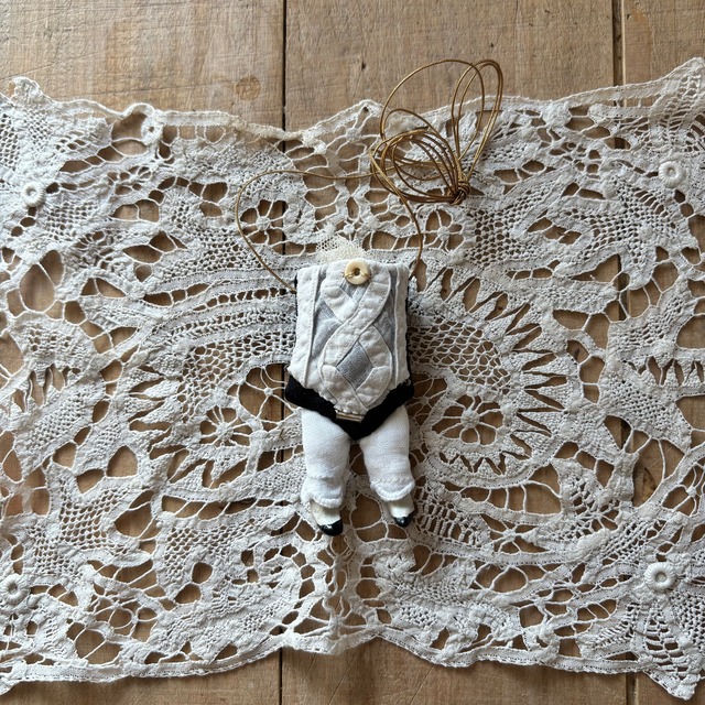 jouet amulette (おもちゃみたいなお守り) お腹には今回サンタマリアノヴェッラの ポプリを入れてありますが、 取り出して、大切ないつも身につけていたい物を入れる事が出来ます 体やレースはアンティーク、足は一つ一つ オーブン粘土で捏ねて作りました 紐はネックレスになるように長くしていますが、短くしてオーナメントにして いただいてもよろしいかと思います 体長 6.5cm 紐長さ 85cm
